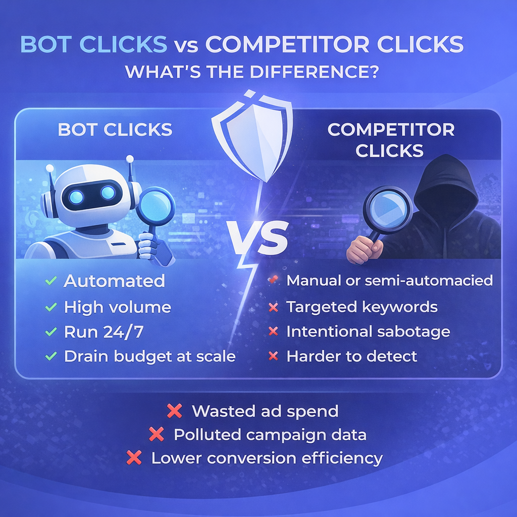 Bot clicks and competitor clicks come from different sources and intentions:
